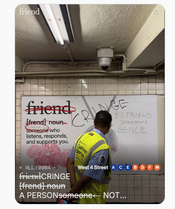 The “Friend” device did a NYC Subway campaign this week that elicited a lot of negative responses and serves as another great example of what it looks like for the cultural immune system to respond to the wrong type of AI intrusion: